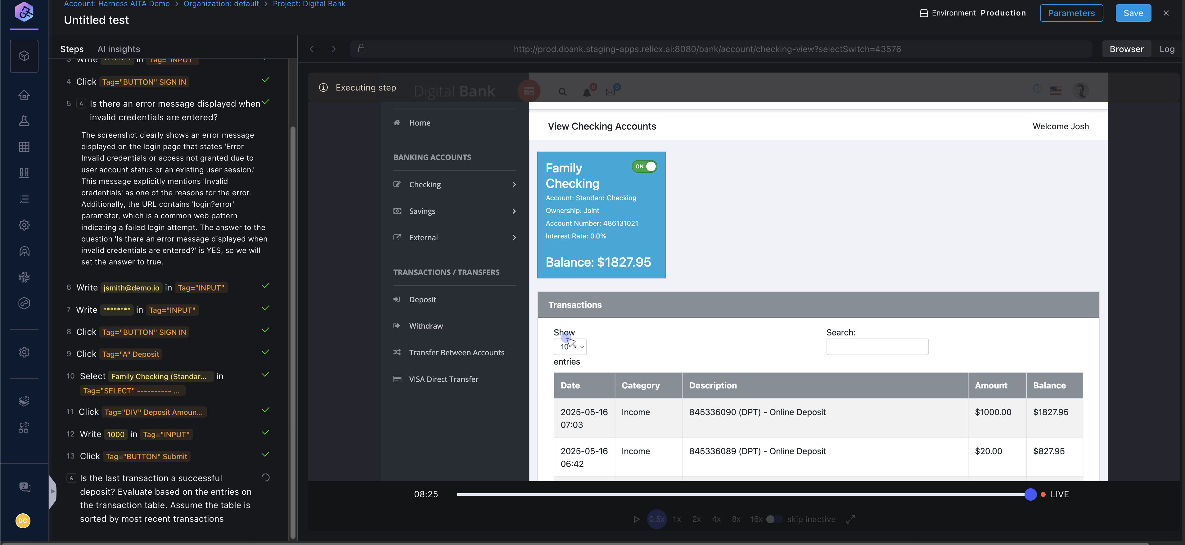 • The AI doesn’t have any context of any previous step in the test. So if you want it to consider any specific criteria include that in the prompt. For example, in the second scenario, I have added the extra context that the transaction table is sorted by date in descending order.