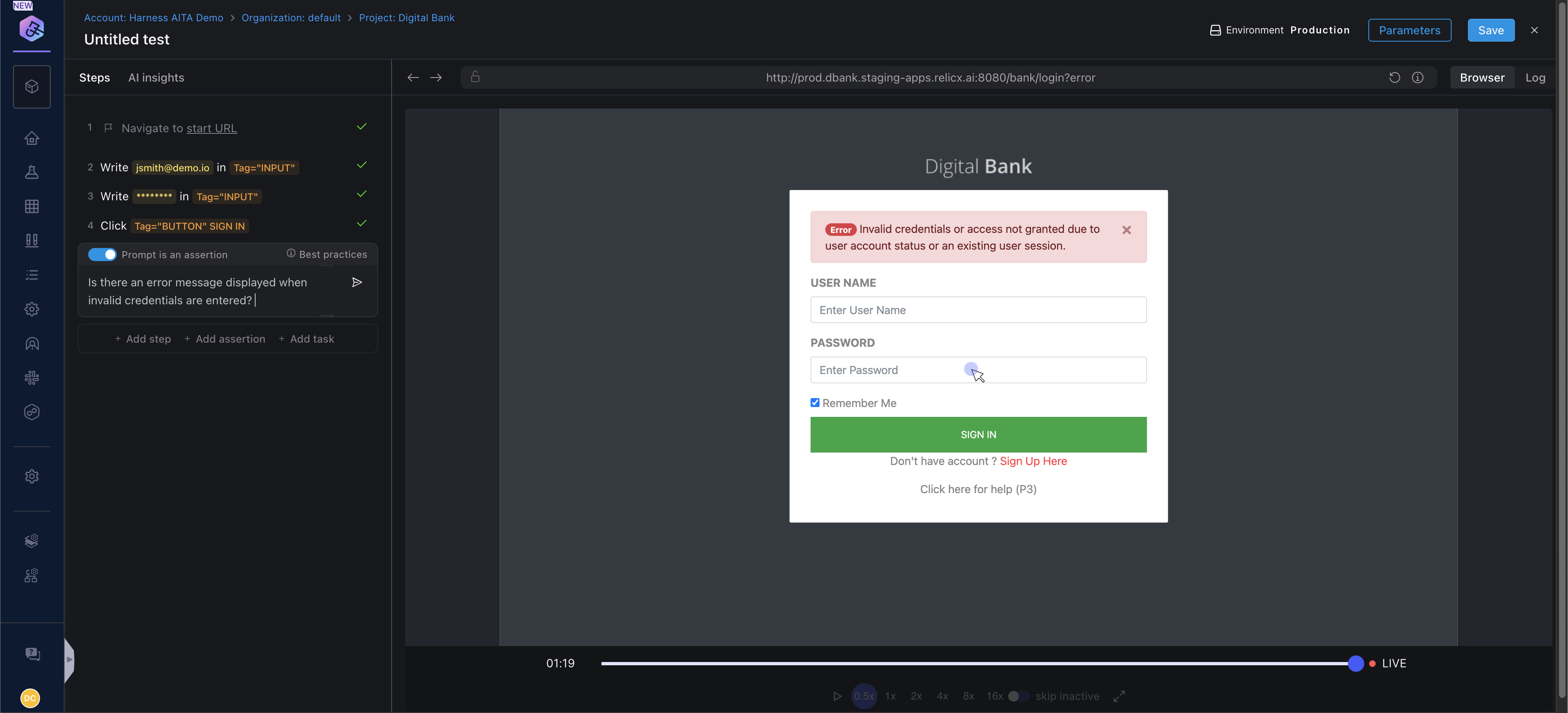 You can select the “Assert user question” assertion type from the list of commands and enter a question like “Is there an error message displayed when invalid credentials are entered?”. The Harness generative AI model evaluates the question and returns true or false depending on the state of the application under test.