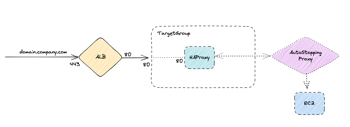 In this scenario, it is not feasible to directly onboard the EC2 instance to AutoStopping as previously done because the ALB does not directly send data to the resource. While it is possible to onboard the HAProxy machine, this is not the desired outcome since the goal is to AutoStop the EC2 machine itself. Additionally, since the HAProxy can be associated with multiple domains and applications, access to any of them would keep the proxy up, which would not result in the expected cost savings.