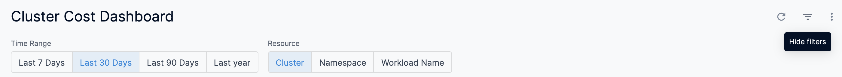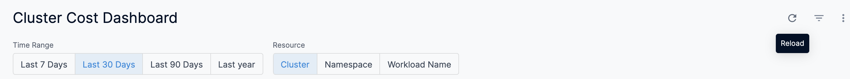 3. Once you have selected the Time Range and Resource filter, click Reload. The data is refreshed with the latest data from the database. By default, the Last 30 Days and Cluster are selected.