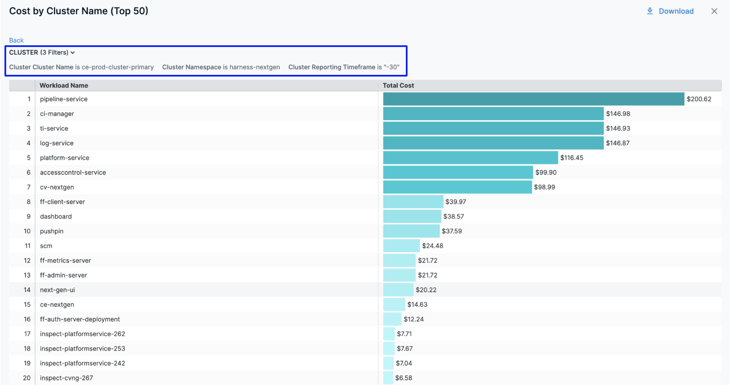 8. You can further drill down and view the cloud cost of a specific Namespace. For example, drill into harness-nextgen and view the cost by Workload Name.