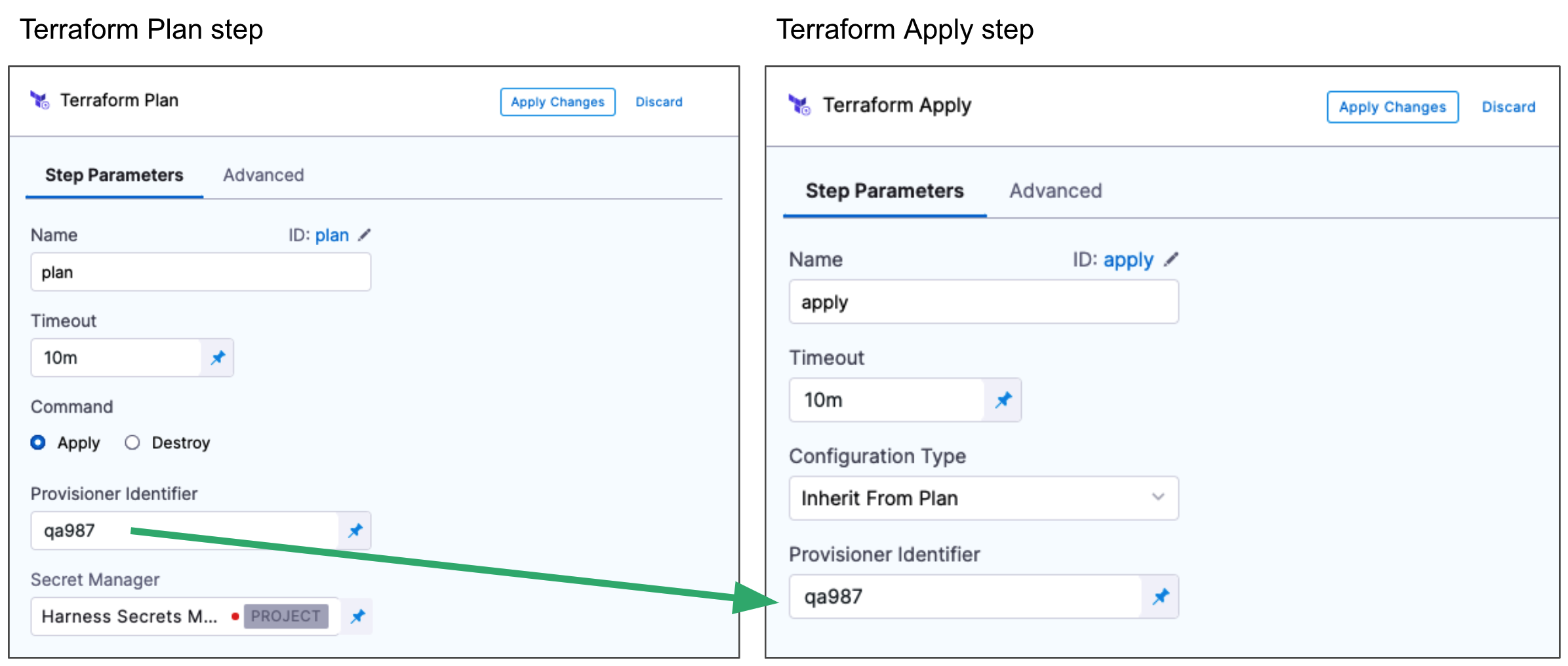 Next, you add the Terraform Apply step, select Inherit from Plan in Configuration Type, and reference the Terraform Plan step using the same Provisioner Identifier.