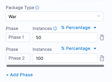 Let’s say you have 10 hosts and you add 2 phases with 50% and 100%. This means Harness deploys on 5 instances in the first phase and on the rest of the instances in the second phase.