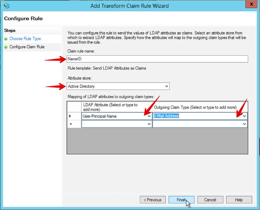 • Set the Incoming claim type as E-Mail Address.