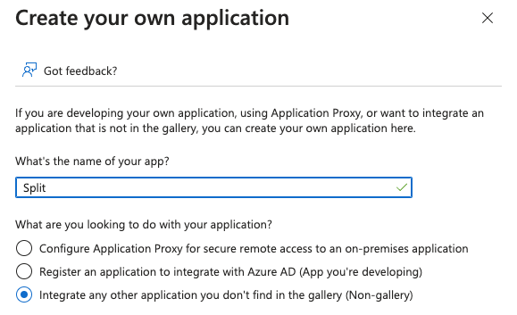 If you do not have JIT enabled and your Azure account's email address does not exist in your Split organization, you can test with a user that is in the Split app you created in Azure and in Split itself. Use the Single Sign-on URL provided in Split in the configuration parameters to test single sign-on using this user.