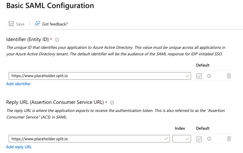 5. In both the Identifier and Reply URL fields, enter https://www.placeholder.split.io and click Save.