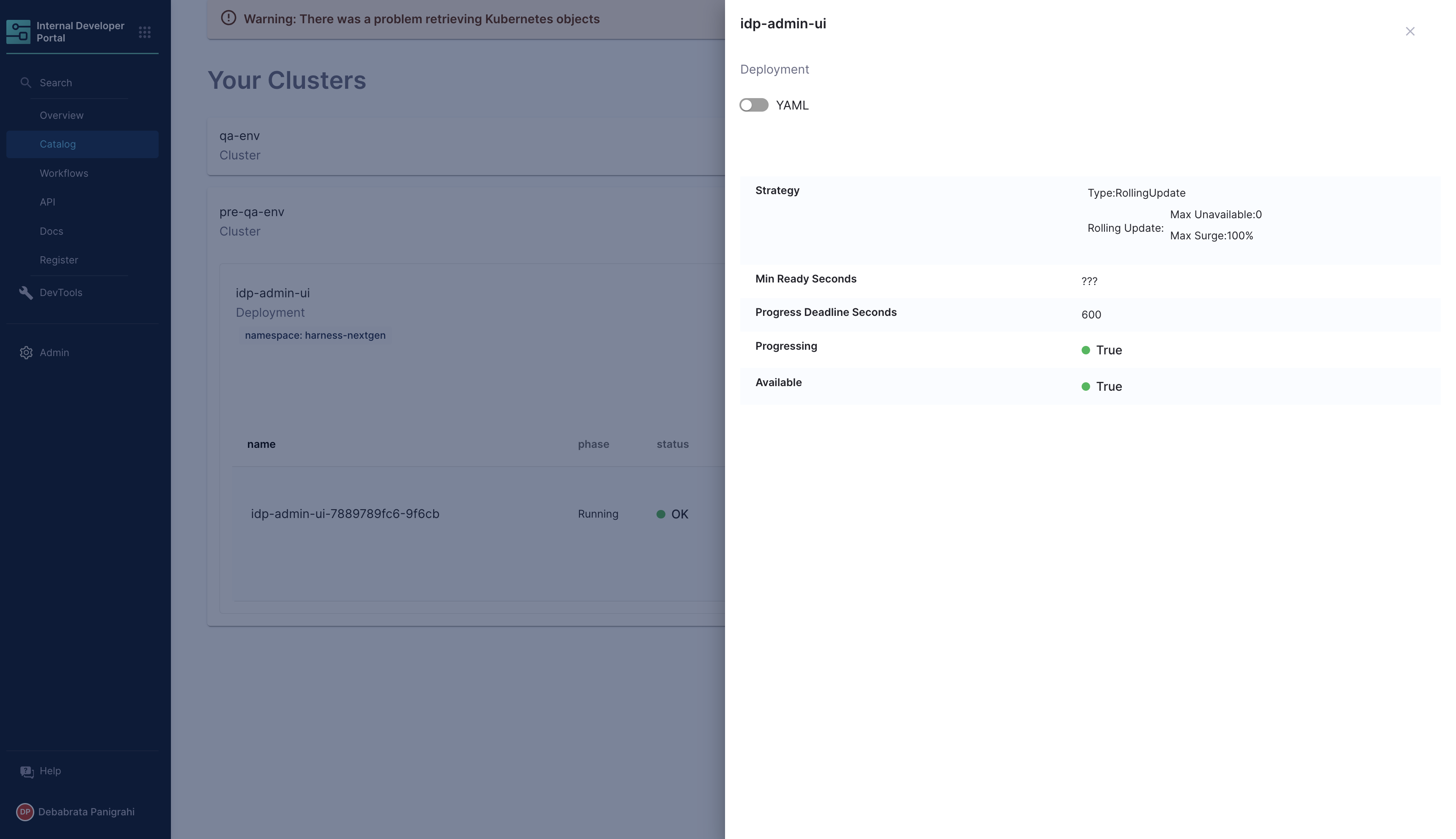 You can as well have a detailed view of your containers and pods, including the YAML view.