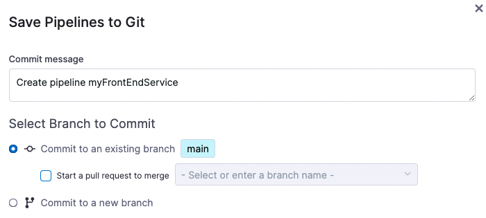 Select Commit to a new branch and enter the branch name. In this case, we save the pipeline in a new branch