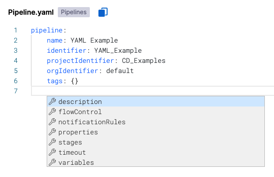 Harness pipeline YAML lets you model your release process declaratively. Each pipeline entity, component, and setting has a YAML entry.