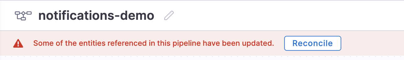 • "Entities referenced in this pipeline have been updated. Please reconcile and save the pipeline to run the latest version."