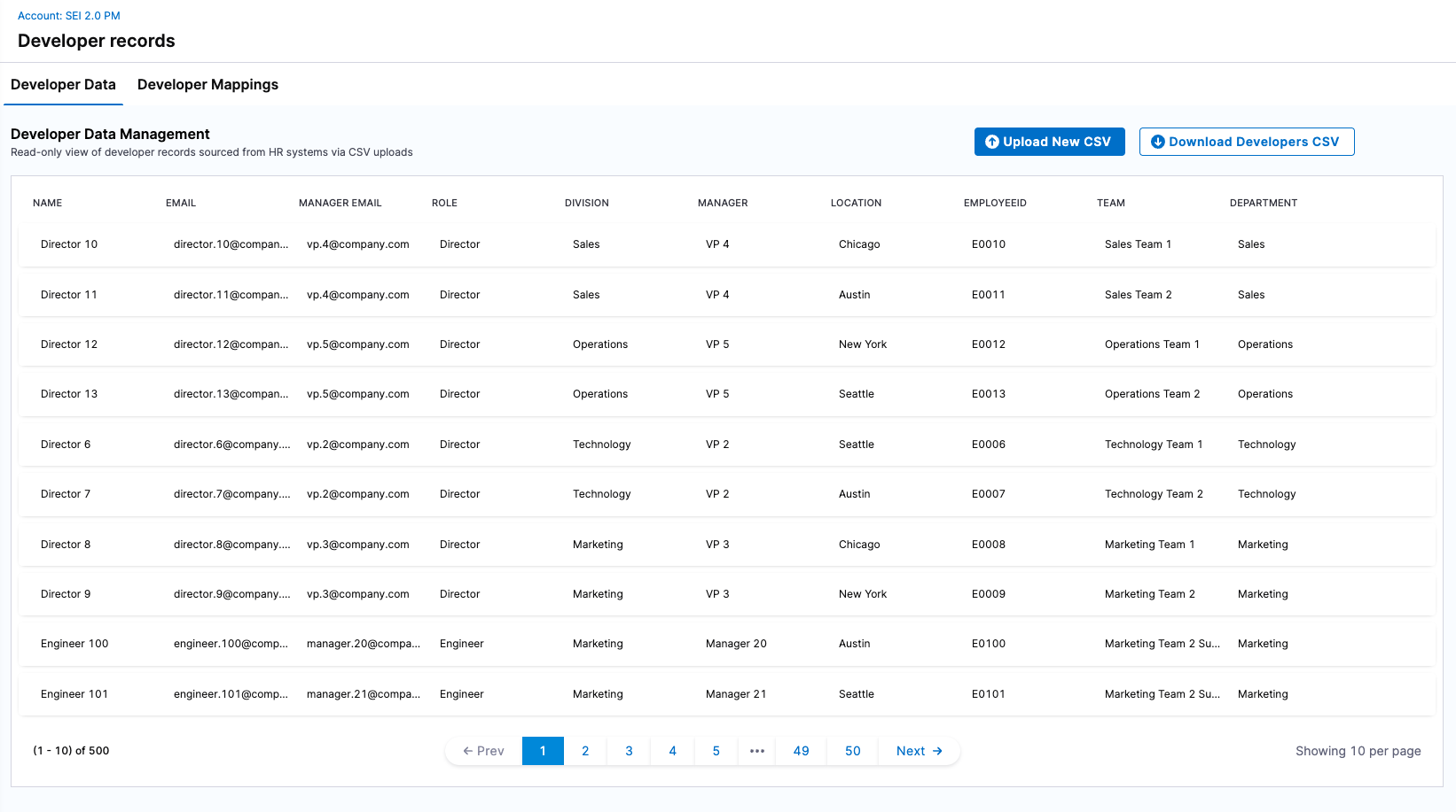 • Developers: Imported from HR systems via CSV and managed at the account level.