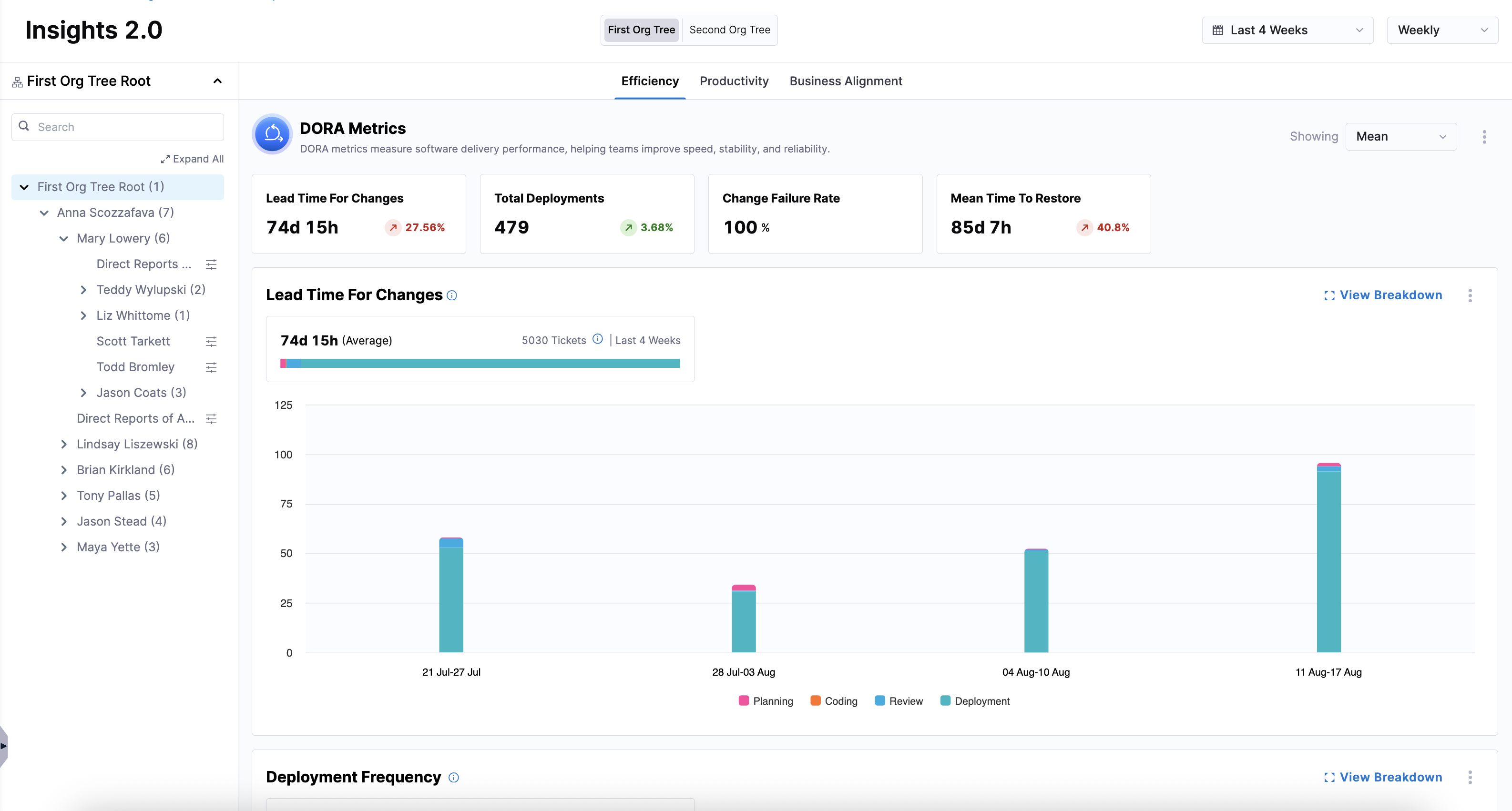 If your organization uses multiple Org Trees, you can switch between them to view insights by selecting a different Org Tree above the Efficiency, Productivity, and Business Alignment tabs.